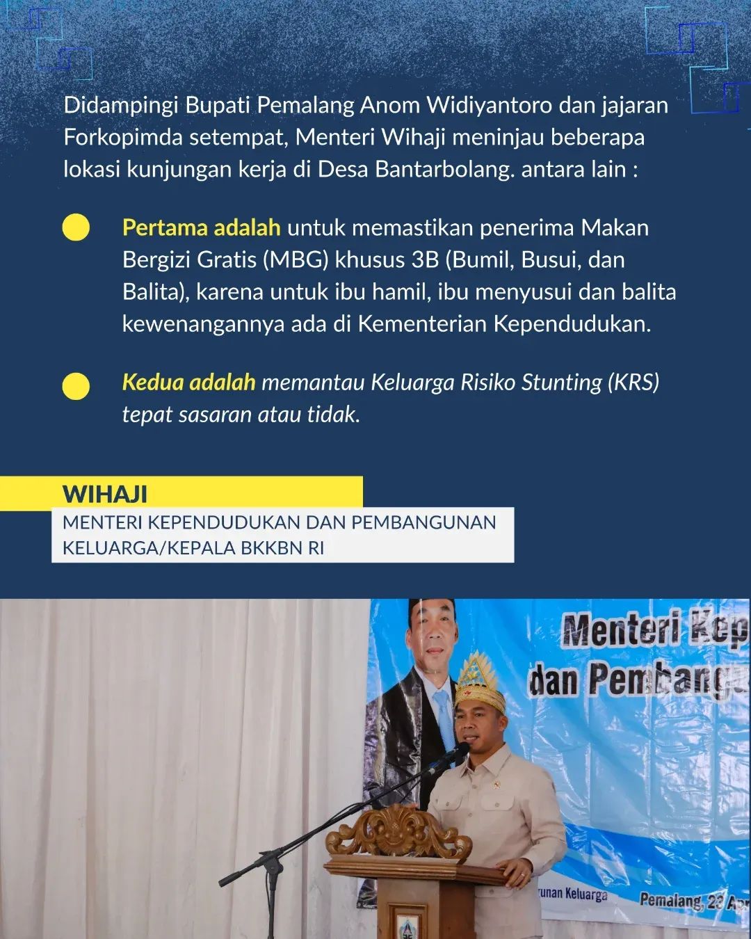 Puncak acara berlangsung di Balai Desa Bantarbolang, yang dihadiri oleh ratusan kader Tim Pendamping Keluarga (TPK) dari seluruh penjuru Kabupaten Pemalang. Dalam arahannya, Menteri Wihaji kembali mengingatkan visi besar Presiden: Kualitas Manusia: Rakyat Indonesia harus sehat dan tangguh. Daya Saing: Menciptakan generasi yang mampu berkompetisi secara global. GENTING: Percepatan penurunan stunting melalui Gerakan Orang Tua Asuh Cegah Stunting.