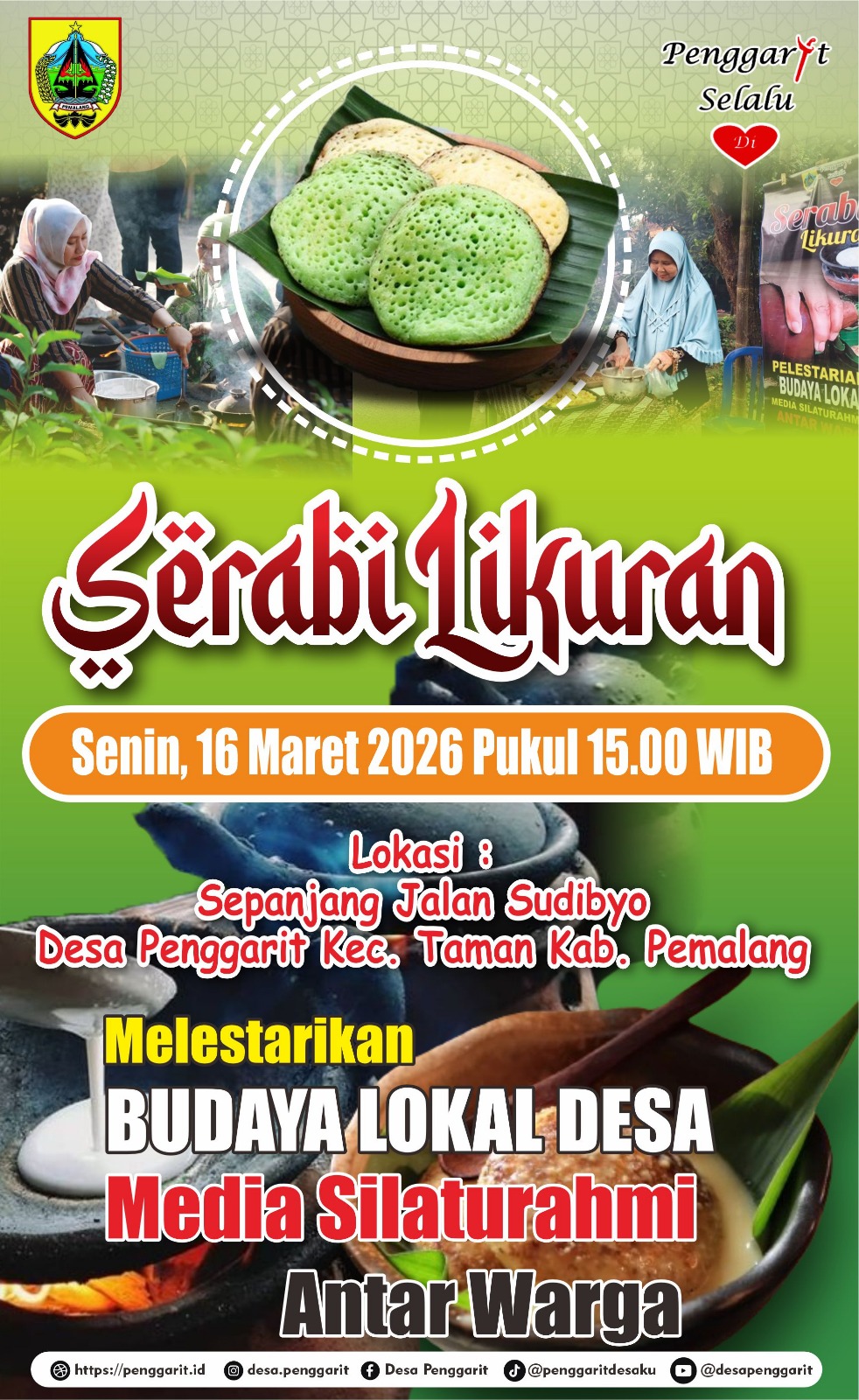 ​Kepala Desa Penggarit, Imam Wibowo, menjelaskan bahwa Serabi Likuran merupakan bentuk nyata pelestarian budaya yang dilaksanakan khusus pada sepuluh hari terakhir Ramadan. Tradisi ini mengajak warga berkumpul untuk menyalakan tungku dan memasak serabi tradisional, atau yang dikenal sebagai cukit, dengan siraman kuah kince yang autentik.”Kegiatan ini bukan sekadar festival kuliner, melainkan perwujudan kearifan lokal kami. Kini kami kemas secara terpusat agar nuansa kebersamaan ini bisa dirasakan oleh warga, para perantau, hingga pengunjung dari luar daerah,” ujar Imam melalui wawancara daring, Minggu (15/03/2026).